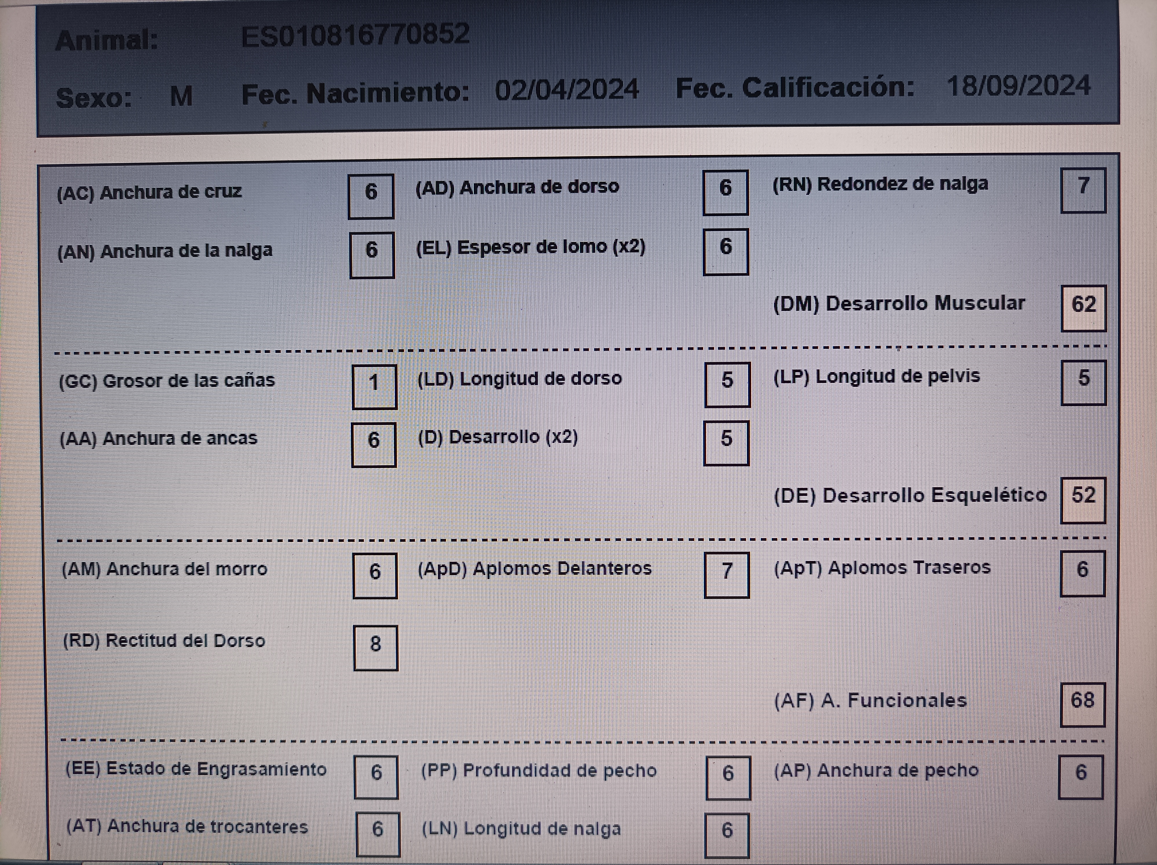 Victorioso-HMM nacido el 02/04/2024. Monta natural de nuestro semental OJO. calificaciones al destete: DM 62, DE 52, AF 68. Abuelo materno Bel Orient
