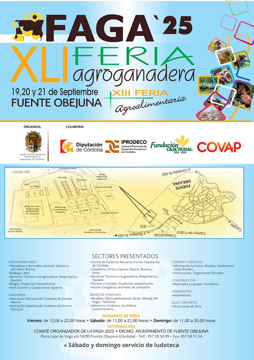 Los días 19-20 y 21 de Septiembre se celebrará en el recinto ferial de Fuenteobejuna la tradicional Feria Agroganadera de Andalucía FAGA 2025.