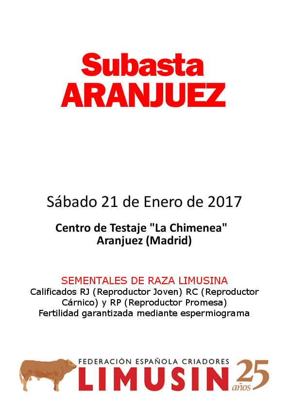 El próximo sábado 21 de enero a las 13 horas se celebrará una subasta en el centro de Testaje "La Chimenea", situado en Aranjuez, con novillos participantes de la serie número 64 de Aranjuez con título de Reproductor Joven, Reproductor Cárnico y Reproductor Promesa, valorados geneticamente y con fertilidad garantizada mediante espermiograma.