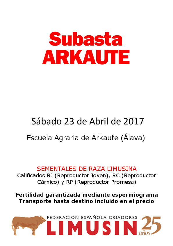 El domingo 23 de abril a partir de las 11 horas tendrá lugar la subasta de sementales de raza limusina, en la que participan 6 ganaderías con 7 toros procedentes del Centro de Testaje de AIA (6 Reproductores Jóvenes y 1 Reproductor Cárnico). Los animales disponen de análisis de fertilidad.