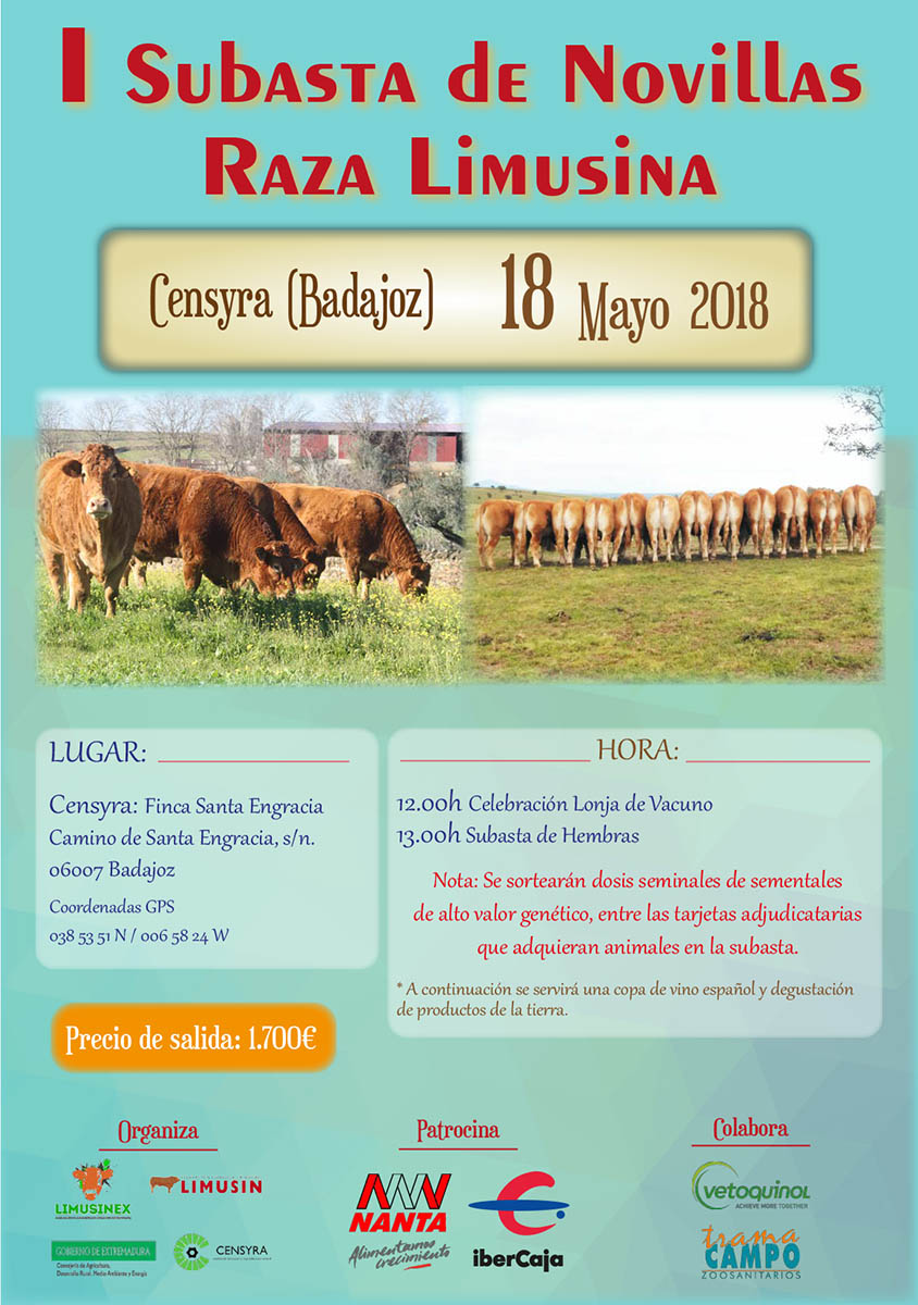 “I SUBASTA DE HEMBRAS DE RAZA LIMUSINA” que se celebrará en las instalaciones del Censyra el próximo día 18 de mayo de 2018 a las 13 horas, evento único y pionero en España.