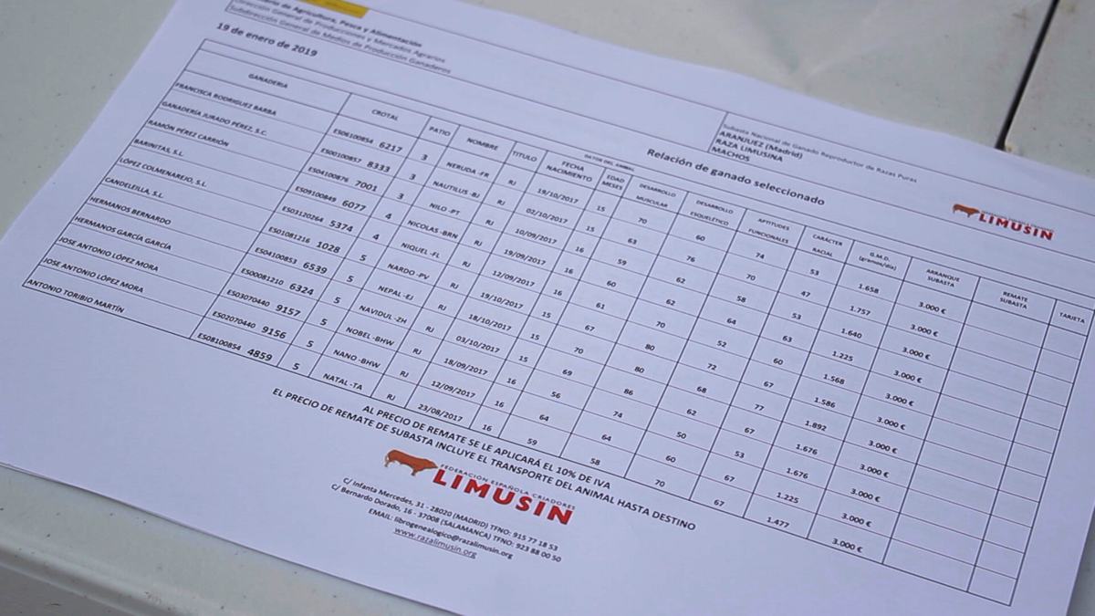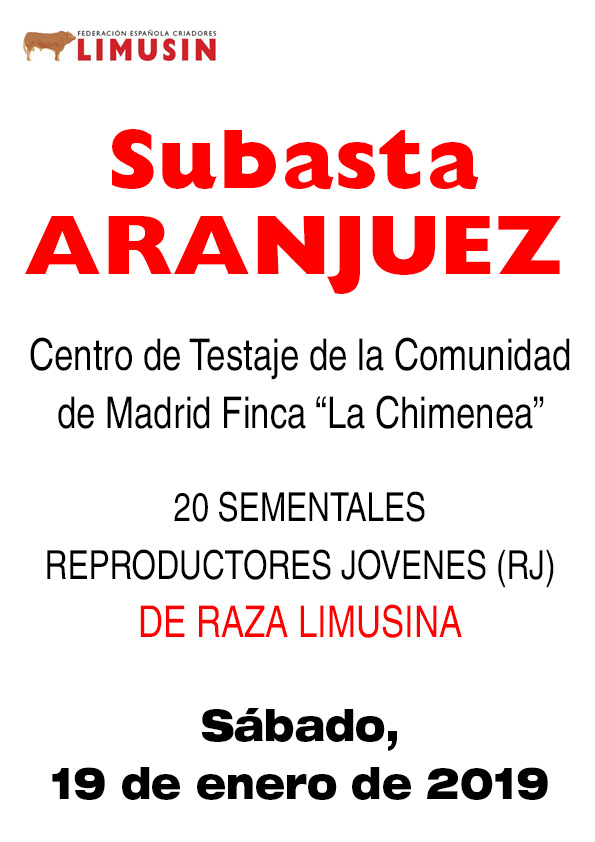 El sábado 19 de enero se subastaron 19 novillos , sementales selectos de raza limusina en el Centro de Testaje ubicado en la Finca “La Chimenea”, en la carretera de Chinchón a Villaconejos M-305, junto al Cortijo de San Isidro, en Aranjuez (Madrid),propiedad del IMIDRA. Ver ubicación.