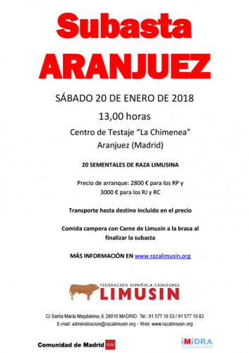El Sábado 20 de Enero tendrá lugar la subasta de Aranjuez en el Centro de Testaje "La Chimenea", donde se subastarán 20 sementales de Raza Limusina.