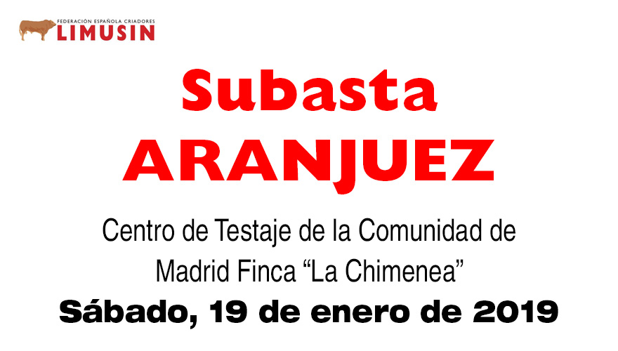 La Federación Española de Criadores de Limusín inicia las subastas de 2019 con una puja de 20 reproductores selectos el próximo sábado 19 de enero, a partir de las 13:00 horas, en el Centro de Testaje ubicado en la Finca “La Chimenea”, en la carretera de Chinchón a Villaconejos M-305, junto al Cortijo de San Isidro, en Aranjuez (Madrid),propiedad del IMIDRA. Ver ubicación.