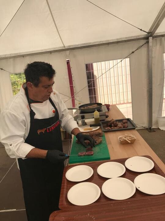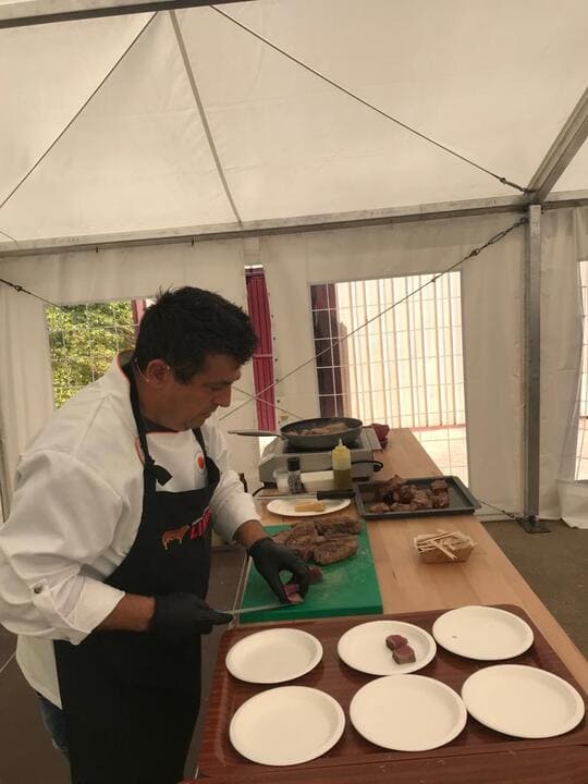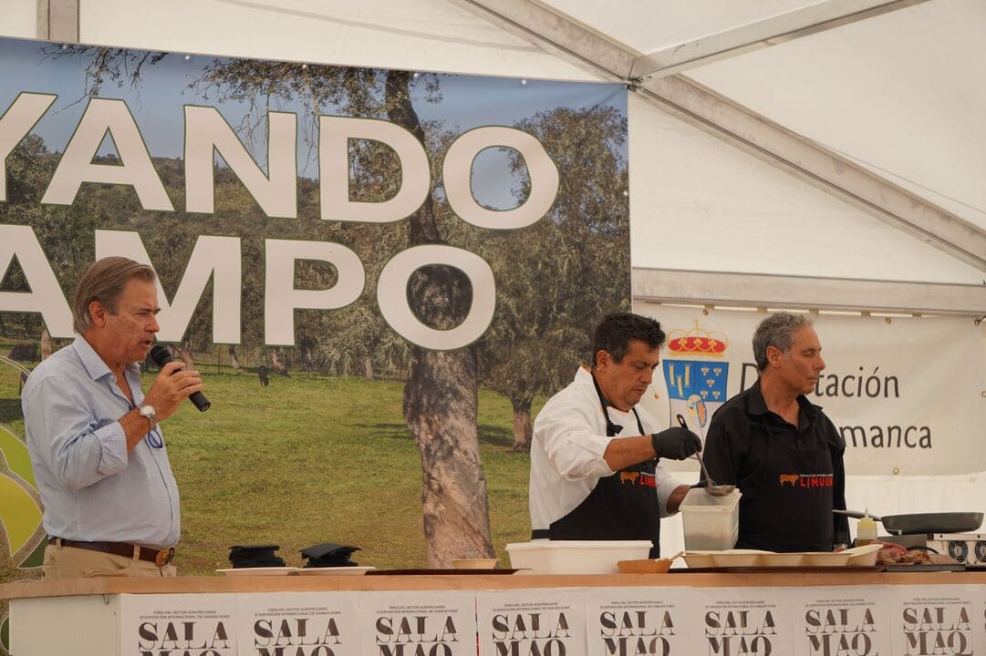 Su fama le viene sobre todo por sus showcookings en la Vuelta Ciclista a España y en esta Feria cocinó Carne de Limusín y hubo una degustación posterior entre los asistentes.
